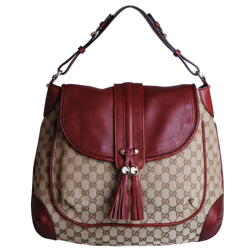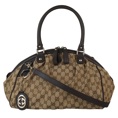 GUCCI 經典G吊牌造型抓皺手提/肩背兩用包(咖啡)