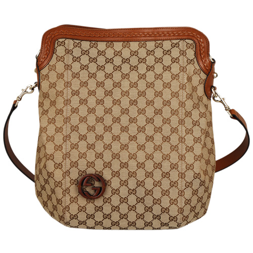 GUCCI 經典緹花牛皮滾邊木製LOGO手提肩背兩用包(咖啡)