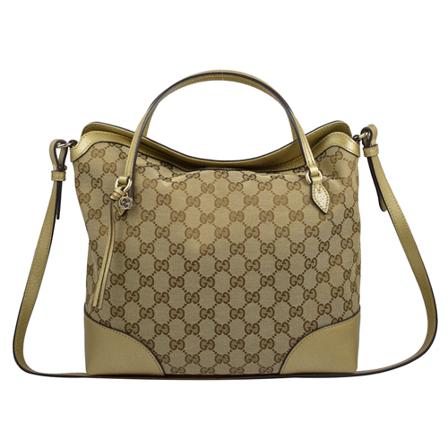 GUCCI 經典雙G緹花皮飾邊兩用仕女包.駝/金邊