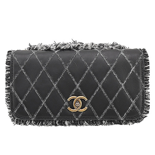 CHANEL 經典雙C logo造型菱格紋毛呢滾邊鍊帶包(黑)